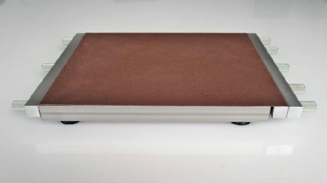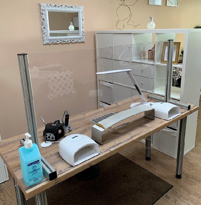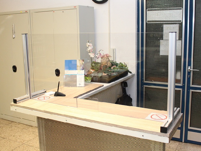 Zum Aufstellen an Ladentheken mit Publikumsverkehr, an Kassen, in Büros, Werkstätten oder Laboren zwischen Mitarbeitern, in Gaststätten auf den Gästetischen, in Nagelstudios, Fußpflege usw. Ausführung mit Aufstellfüßen aus Aluminium und mit Aussparung zum Durchreichen von Waren oder Geld